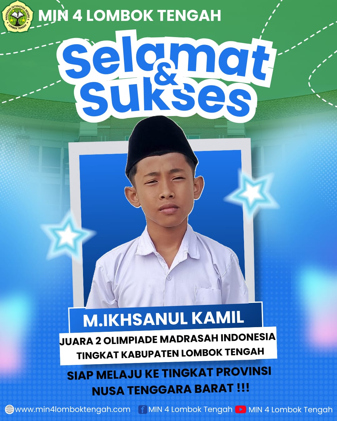 Kepada seluruh siswa MIN 4 Loteng, jadikanlah keberhasilan ini sebagai dorongan untuk terus berprestasi, baik dalam bidang Akademik maupun non-akademik. Mari bersama-sama kita buktikan bahwa Madrasah mampu melahirkan generasi unggul yang berilmu, berakhlak mulia dan berdaya saing ( Rhtl )