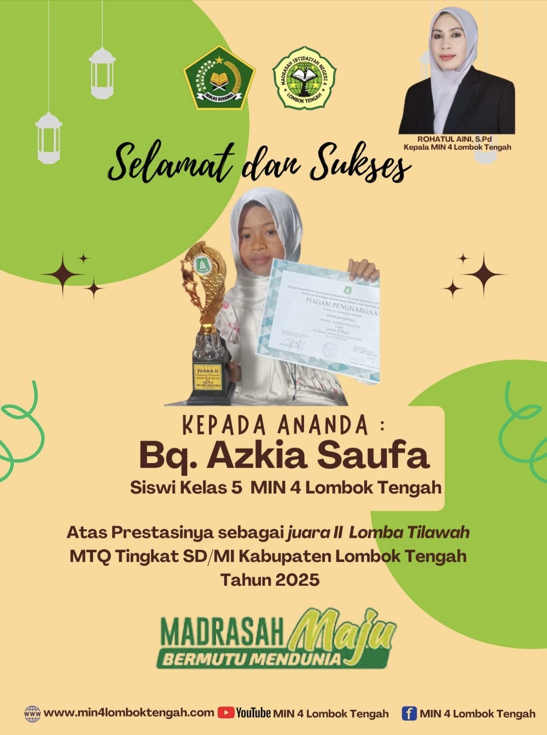 Kegiatan Ekstrakurikuler Tilawah Al-Qur’an yang rutin diselenggarakan setiap hari kamis sore di MIN 4 Lombok Tengah kembali menunjukkan hasil yang membanggakan. Salah seorang siswi : BQ. AZKIA SAUFA Kelas.V berhasil meraih Juara II Lomba Tilawah MTQ Tingkat SD/MI Kabupaten Lombok Tengah.